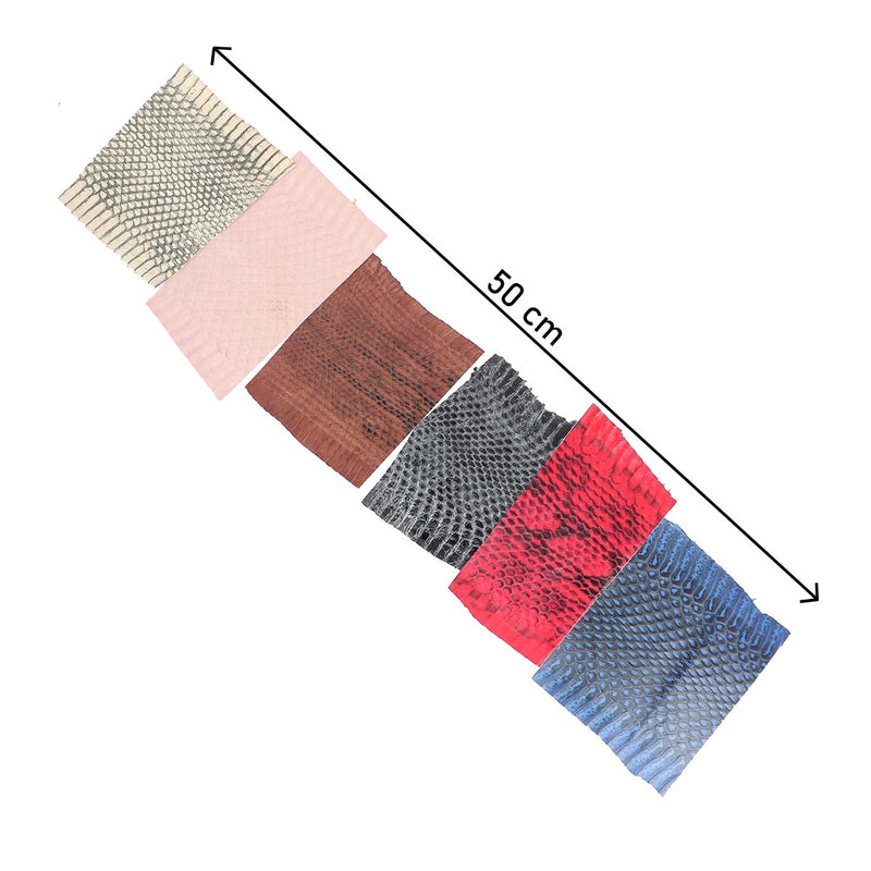 Jedes Los ist ein Unikat und umfasst eine Vielzahl unterschiedlicher Stücke aus Schlangenleder , insgesamt 50 cm lang (alle Stücke zusammen) und zwischen 8 und 15 cm breit.