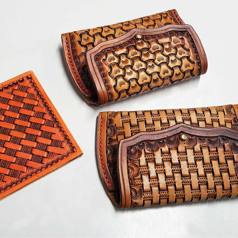 Korbgeflecht-Griffstempel haben ihren Namen von dem Muster, das entsteht und an einen geflochtenen Korb erinnert. Sie ermöglichen die schnelle Reproduktion desselben Musters, um einen Materialeffekt zu erzielen und die Beibehaltung einer großen glatten Oberfläche zu vermeiden. Durch ihre Verwendung können Sie außerdem Lederfehler kaschieren. Das durch die Kompression des Materials entstehende Relief verstärkt das Leder und macht Ihre Kreationen unempfindlicher gegen Kratzer. Es gibt sie in vielen Mustern, die jeweils mehrere Breiten haben können. Sie können sie gerade oder schräg verwenden, mit unterschiedlichen Ergebnissen.