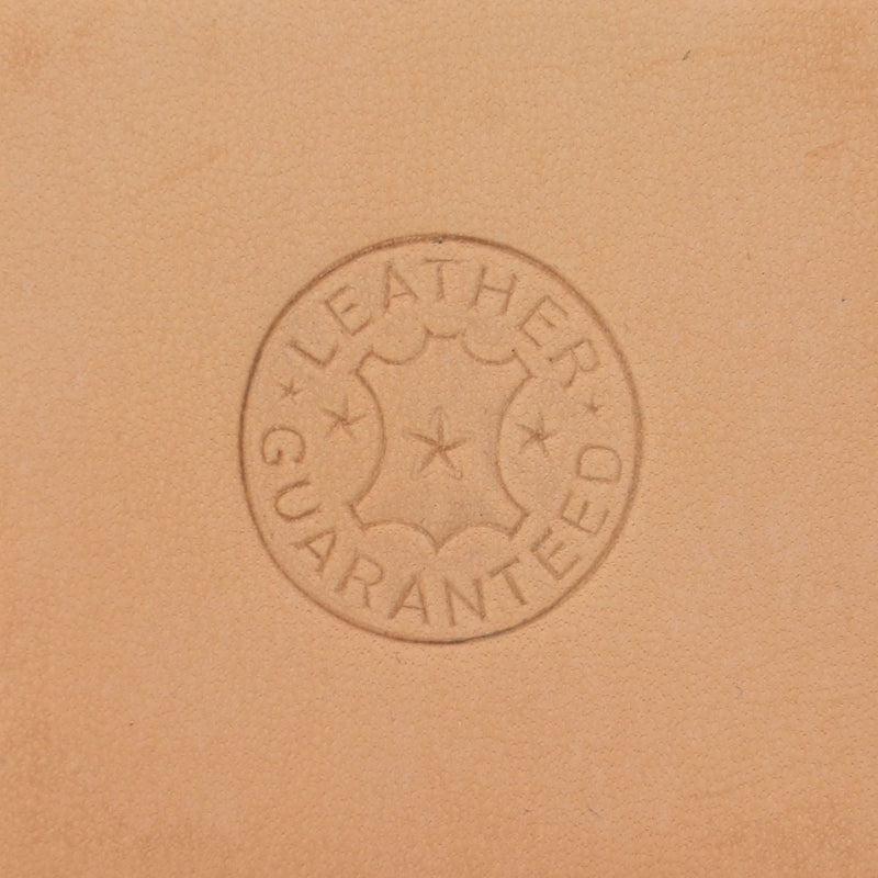 Das Muster auf diesem Stempel ist ein Kreis mit den Worten „LEATHER GUARANTEED“ darauf .