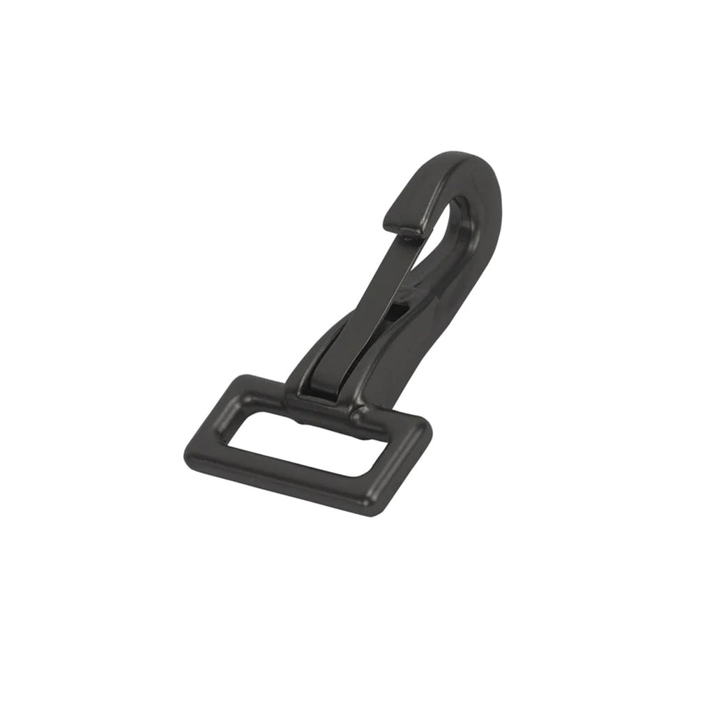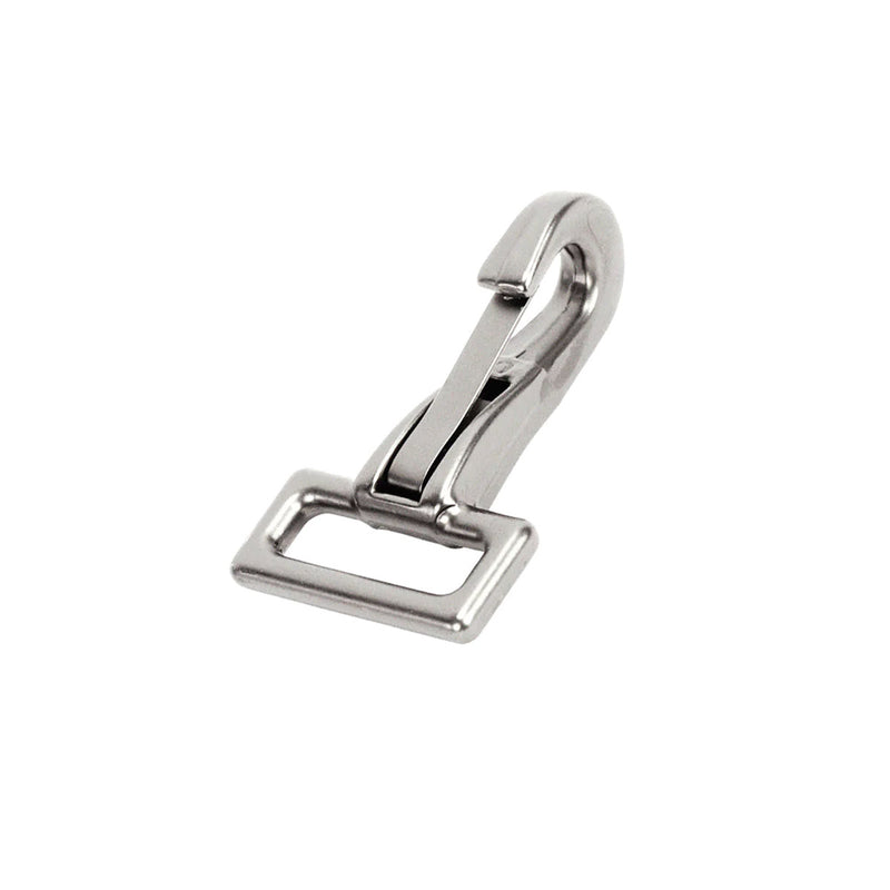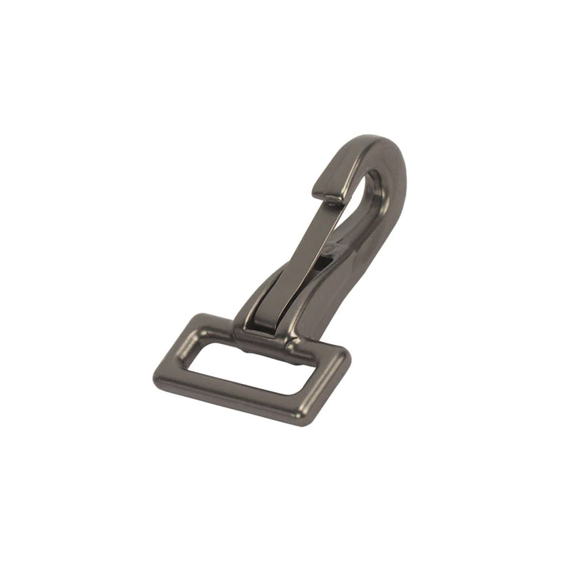 Karabiner mit fester, flacher Öse für ein Lederband. Das Öffnen erfolgt durch Drücken auf die Lasche.