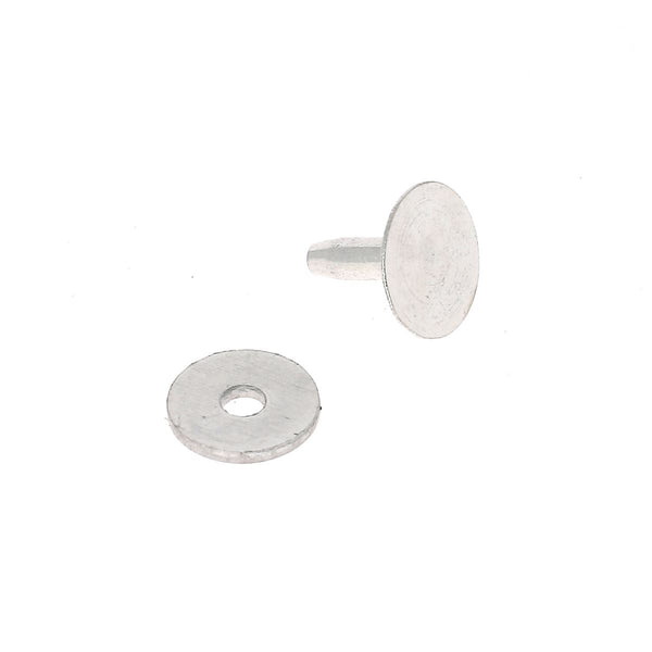 Bohren Sie in die zu montierenden Teile ein Loch (3 mm für T28- und T35-Nieten oder 4 mm für T41-Nieten). Führen Sie den Niet durch die Innenseite Ihrer Teile. Schrauben Sie die Unterlegscheibe auf und ziehen Sie sie anschließend mit dem Montagewerkzeug fest. Schneiden Sie den Überschuss mit einer Zange ab, sodass etwa 2 mm Material übrig bleiben. Beginnen Sie mit dem Mattieren, indem Sie den konkaven Teil des Setzwerkzeugs verwenden. Schließen Sie die Montage ab, indem Sie die Stange mit einem Hammer auf die Unterlegscheibe klopfen. Der Mattierungsvorgang muss auf einer festen Arbeitsfläche durchgeführt werden. Sie können eine Ertalon-Platte anbringen, um Ihre Arbeitsfläche und den Kopf der Niete zu schützen.