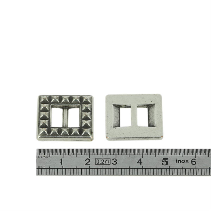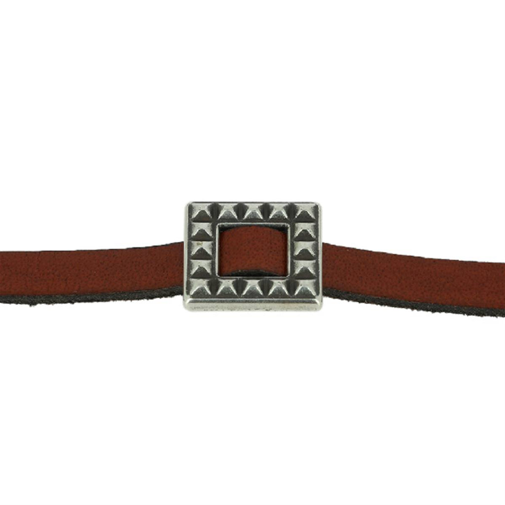 Schieber zwischen zwei Quadraten mit Nieten für ein Lederband von 10 mm Breite und maximal 3 mm Dicke. Ideal für Ihre Armband-, Schmuck- und Deko-Kreationen.Material: Zamak garantiert nickelfrei