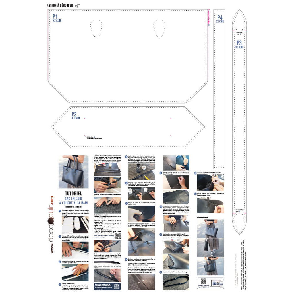 Papiermuster in Originalgröße (A1-Poster) und Anleitung zum Herstellen einer handgenähten Lederhandtasche.