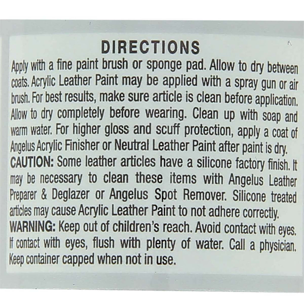 Angelus-Farben sind Qualitätsfarben mit hohem Pigmentgehalt. Die Farbe muss vor Gebrauch durch kräftiges Schütteln der Flasche gut vermischt werden. Manche Farben lassen sich nur schwer mischen und beim Auftragen können kleine Klümpchen entstehen. Sie müssen sie lediglich mit der Bürste glätten, damit sie verschwinden. Dies ist normal und stellt keinen Qualitätsmangel dar.