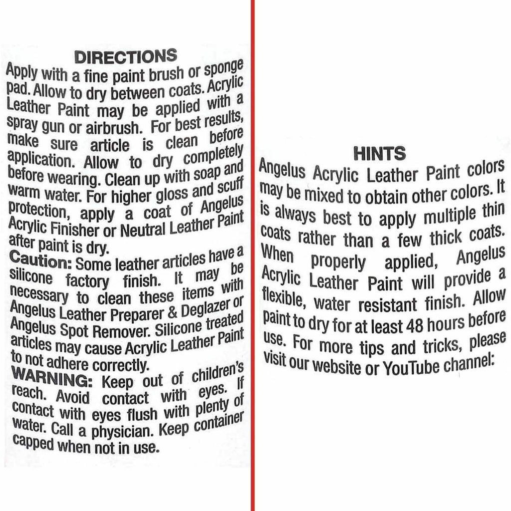 Angelus-Farben sind Qualitätsfarben mit hohem Pigmentgehalt. Die Farbe muss vor Gebrauch durch kräftiges Schütteln der Flasche gut vermischt werden. Manche Farben lassen sich nur schwer mischen und beim Auftragen können kleine Klümpchen entstehen. Sie müssen sie lediglich mit der Bürste glätten, damit sie verschwinden. Dies ist normal und stellt keinen Qualitätsmangel dar.