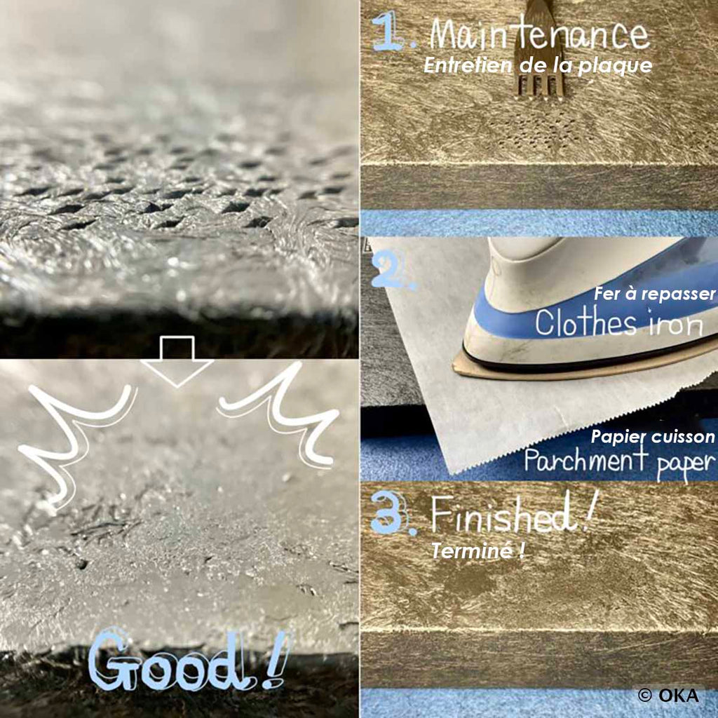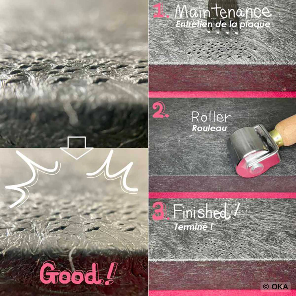 Schlagwerkzeuge hinterlassen mit der Zeit Spuren auf den Schneidplatten, die auf Ihr Leder abfärben können. OKA-Platten haben die Besonderheit, dass sie dank dieser Methoden (siehe Video und Fotos) eine glattere Oberfläche zurückerhalten können: