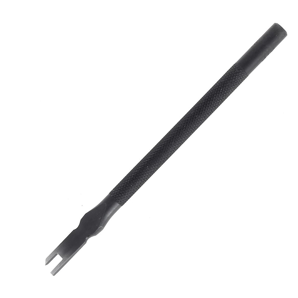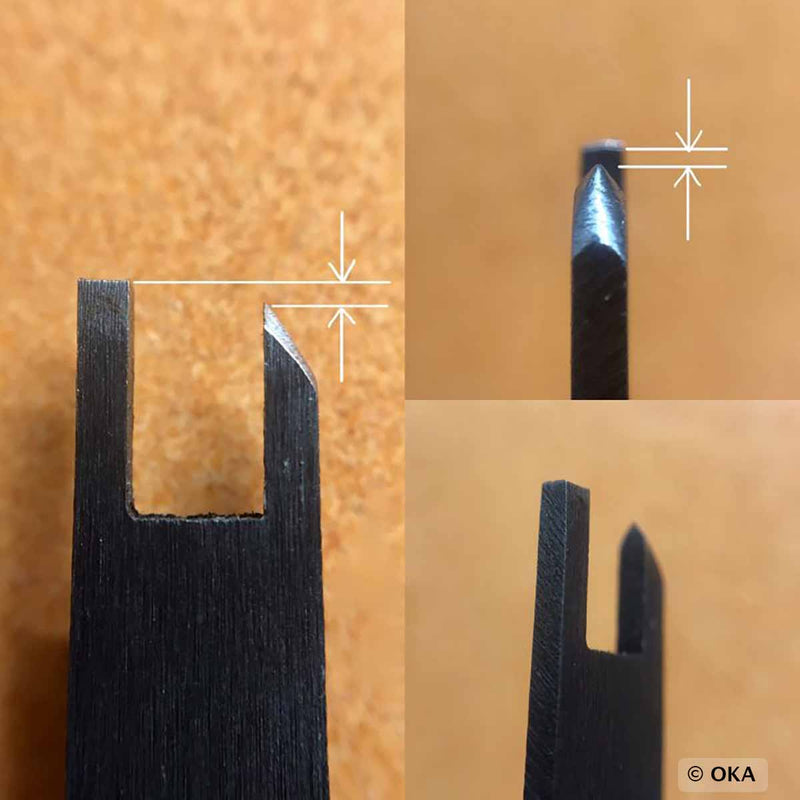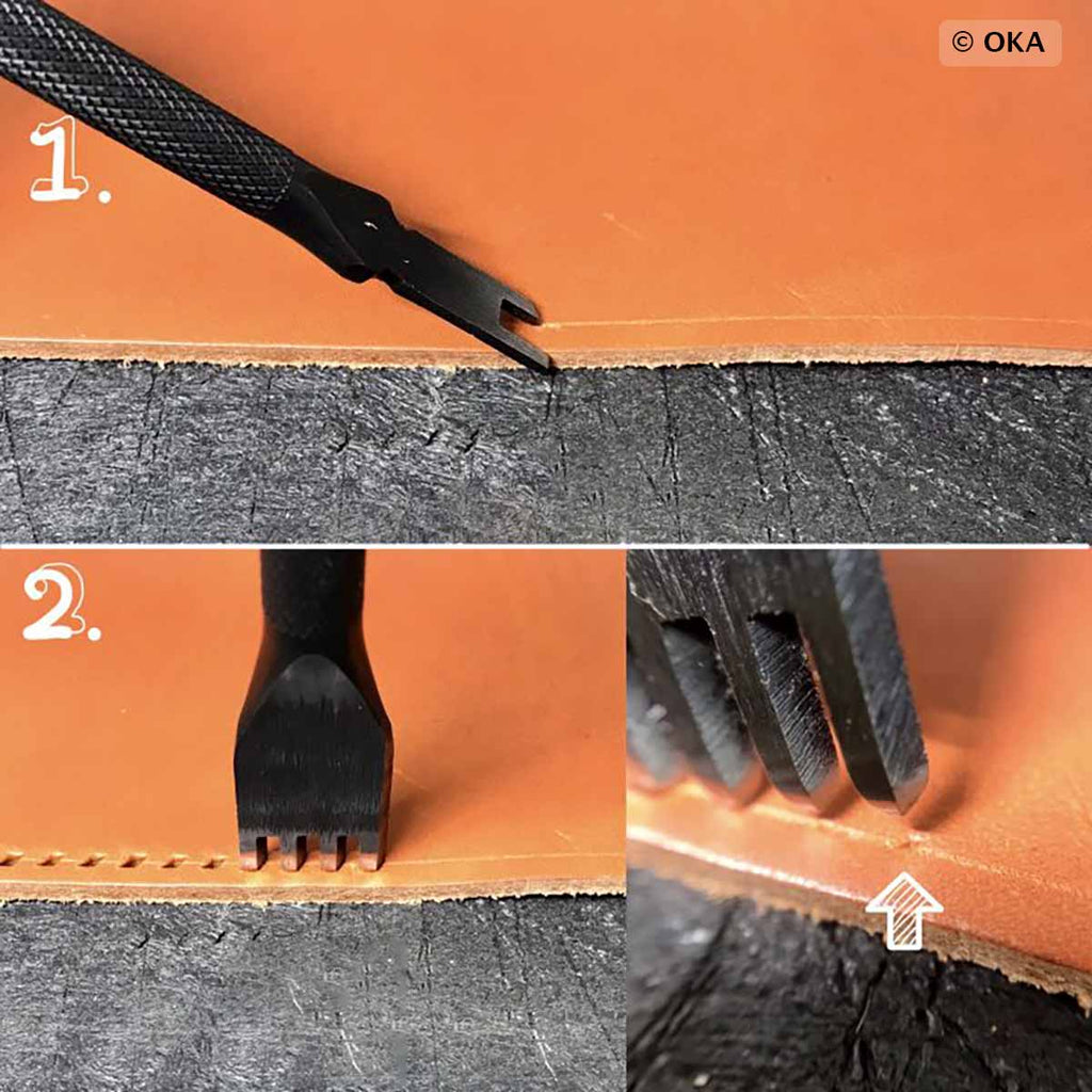 Anwendung : Legen Sie das längste Teil auf die Kante des Leders. Schieben Sie das Werkzeug dann an der Kante des Leders entlang, sodass die scharfe Spitze (kürzerer Teil) das Leder einritzt.