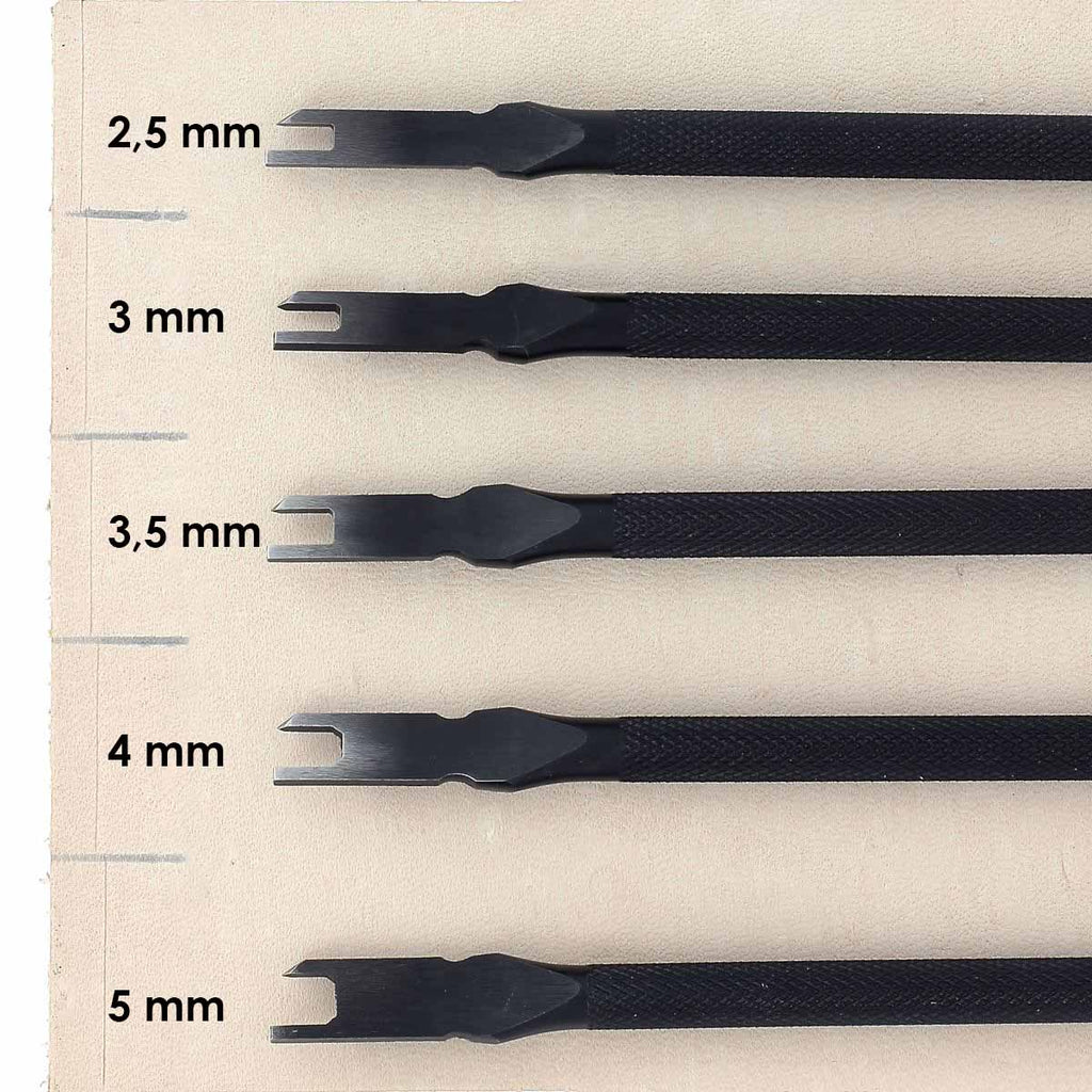 - Abstand zwischen der Lederkante und der gezeichneten Linie: 2,5 mm – 3 mm – 3,5 mm – 4 mm oder 5 mm.