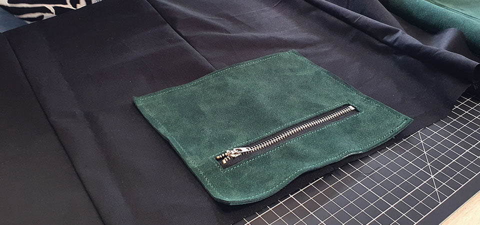 Using double-sided tape, position the zipper in the location indicated on the pattern (P7). Sew the zipper using a zipper foot.