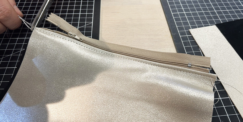 You can also do this step in two stages by sewing the zipper and leather first, then the lining onto the zipper.