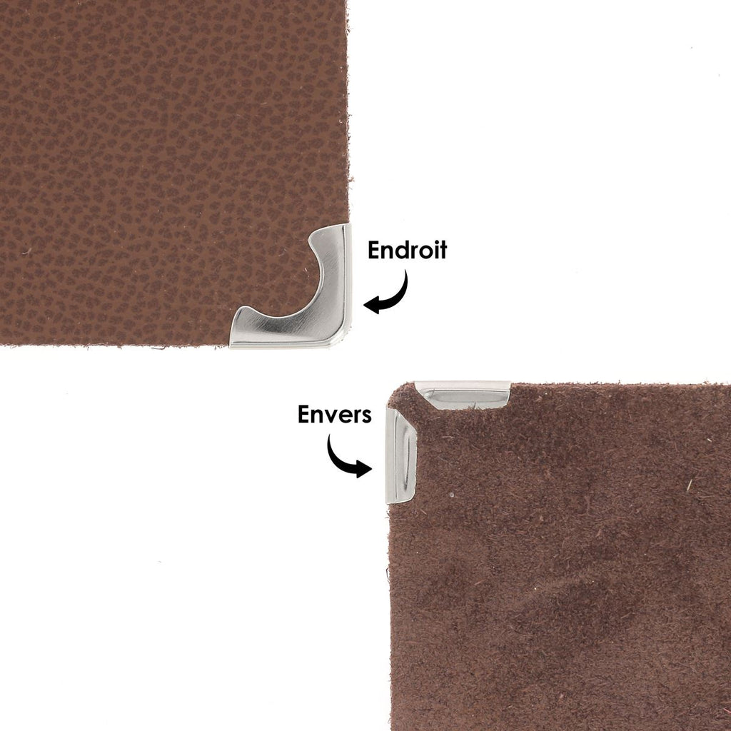 Easy to attach : Cut the corner of the leather to round it slightly. Insert the leather into the metal corner then tighten with flat jaw pliers. In order not to mark the metal corner, it is recommended that the jaws of the pliers be covered with leather ( we recommend using umbrella pliers ref. TA058 ).