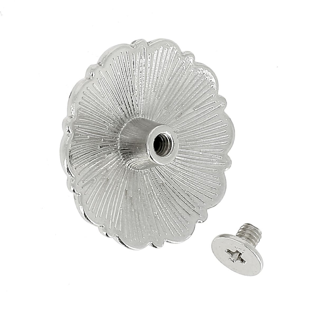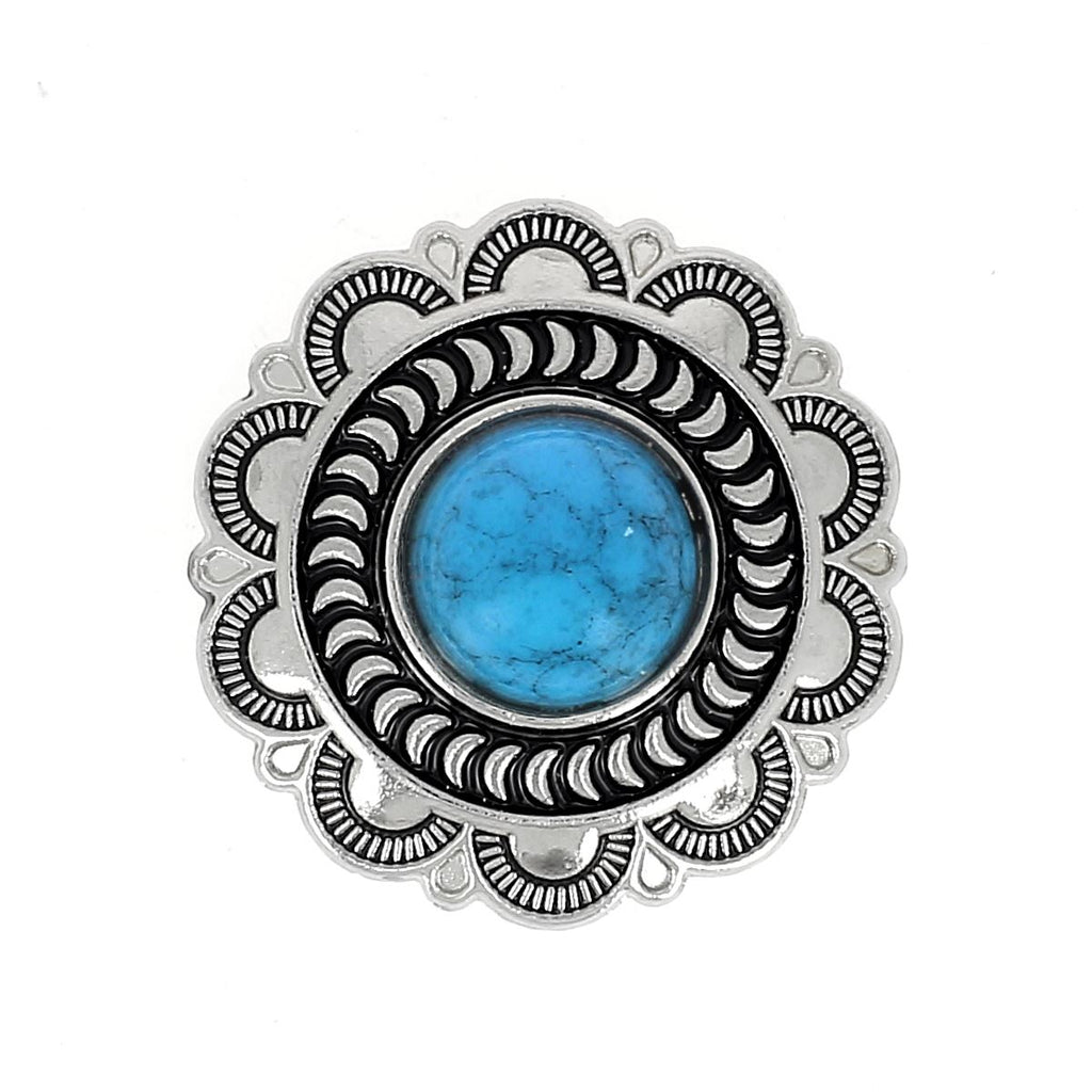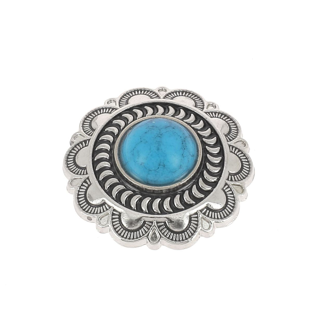 Enhance your leather item with this elegant decorative flower -shaped concho. The faux precious stone in the center of the concho adds a touch of charm and sophistication. The ornamental designs are carefully crafted to represent a delicate blooming flower.