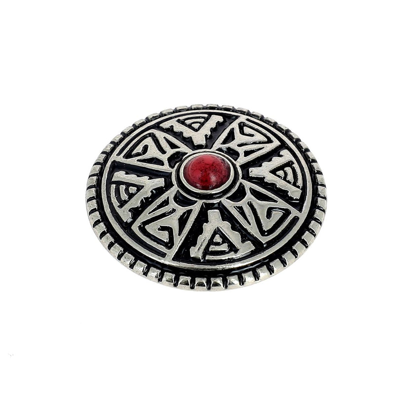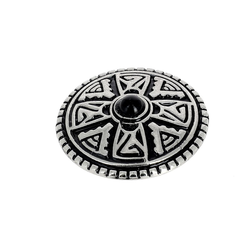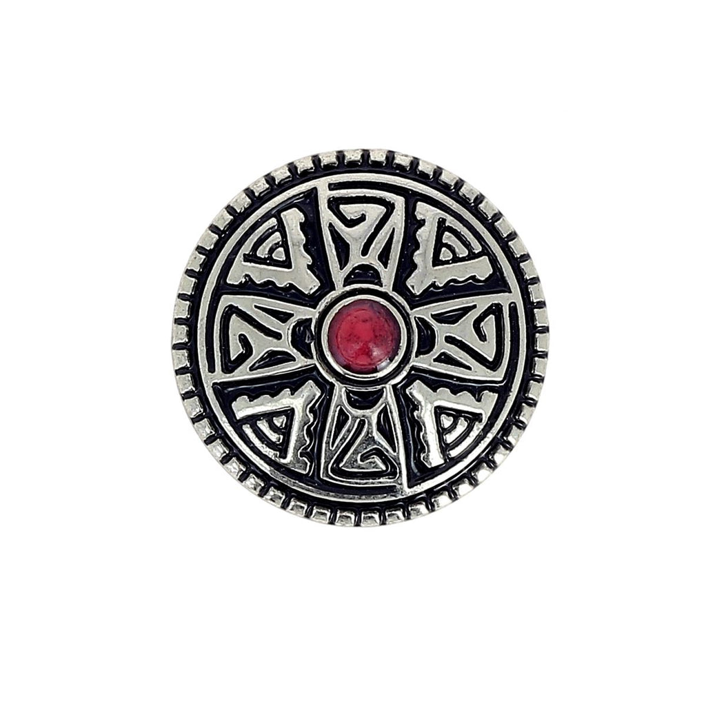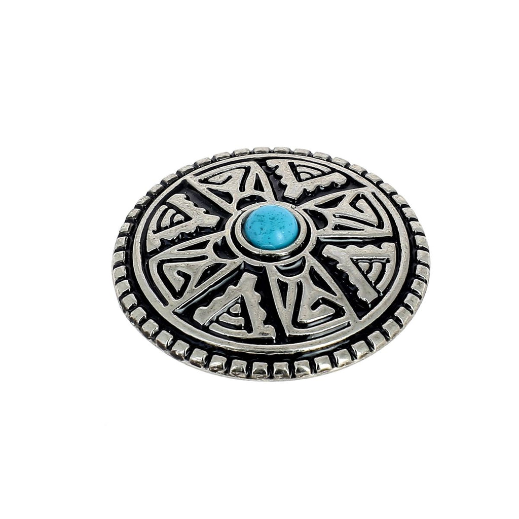 This round screw-on concho has a pretty faux stone bead in the middle and ornamental designs all around.