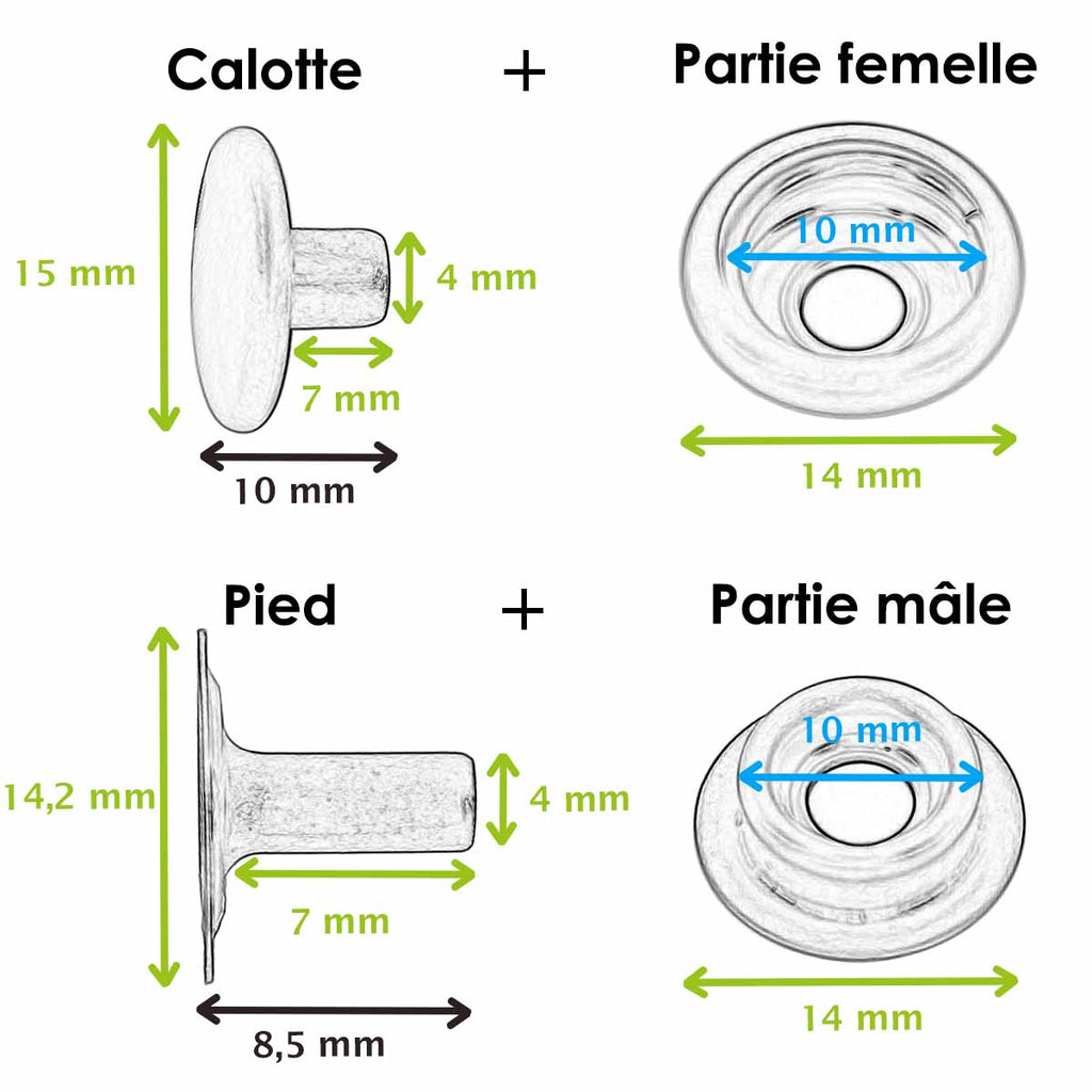 - 10 strong snap buttons with nickel-plated finish
