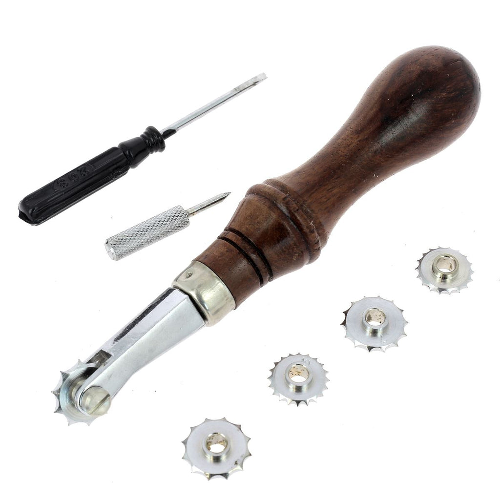 This knurled claw with wooden handle is used to mark stitches for hand sewing.It comes with five wheels of different spacing points. The wheels are removable and can be changed using the small screwdriver provided.