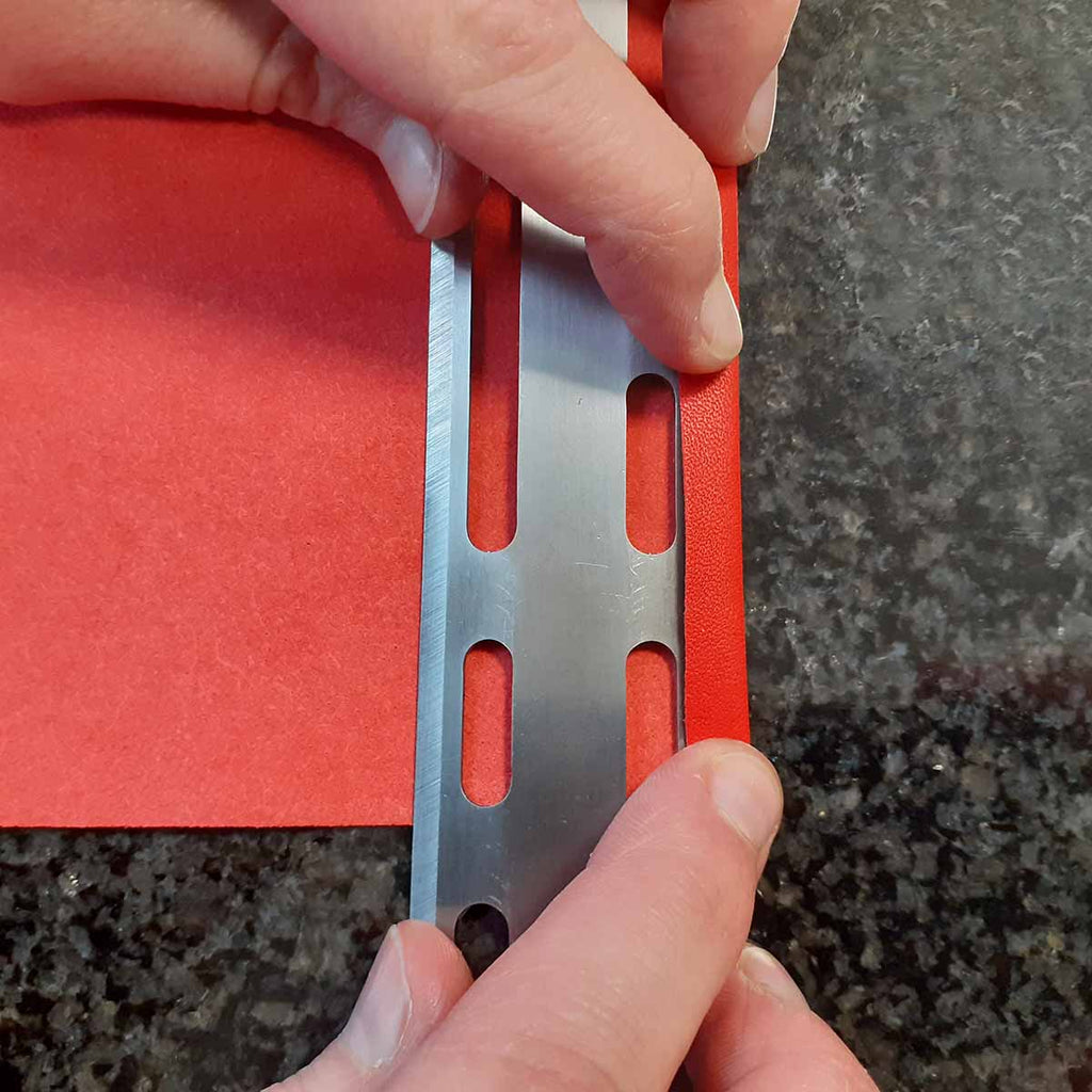 This steel ruler serves as a guide to fold the leather precisely so that it can be glued to itself. It can also be used to cut the leather straight.