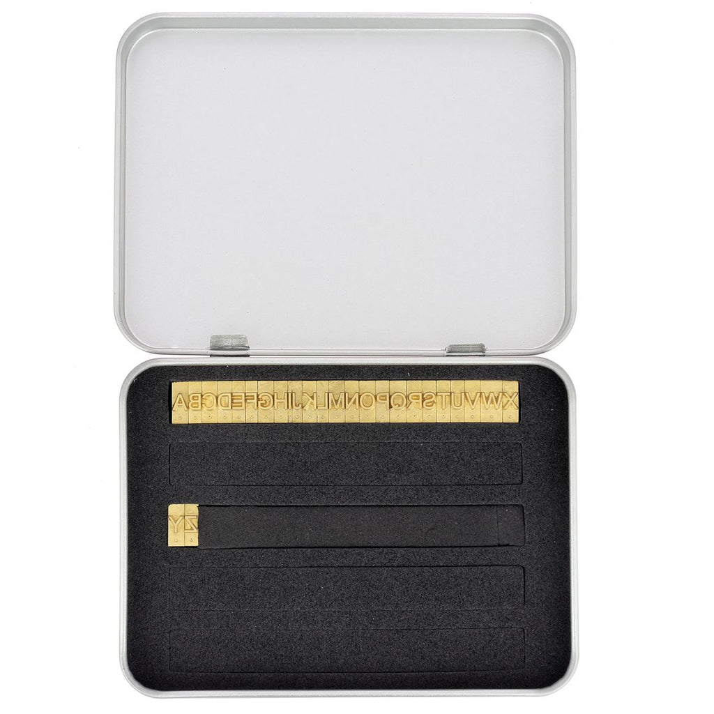 Les 26 lettres de l’alphabet sont fournies dans une boîte en métal pratique, qui permet de ranger tous vos caractères en laiton, y compris ceux achetés séparément à l’unité.