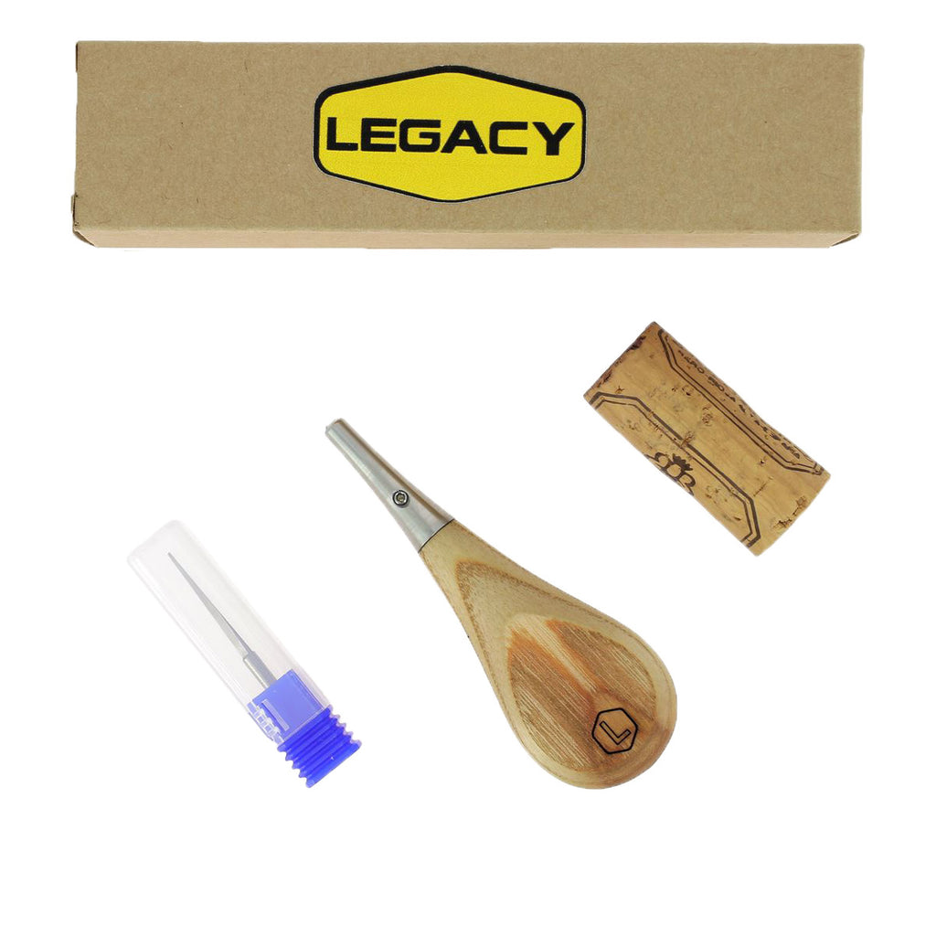 Cette alêne est fournie avec une lame non montée, nécessitant une clé Allen de 1,5 (non fournie) pour l’assemblage. Pour votre sécurité, un bouchon de liège est inclus afin de protéger la lame lorsqu’elle n’est pas utilisée. L’ensemble est présenté dans une élégante boîte siglée Legacy.