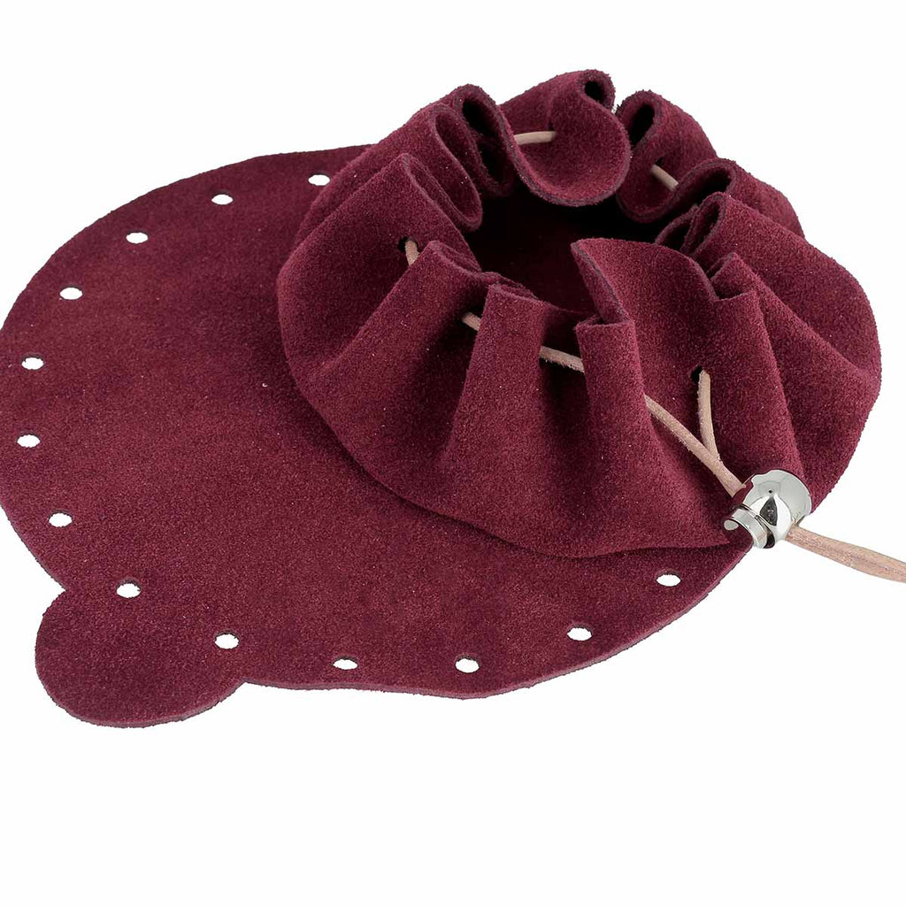 Découpe en croûte de cuir couleur bordeaux pour réaliser une bourse porte-monnaie. Elle est livrée à plat, non montée et sans lien.