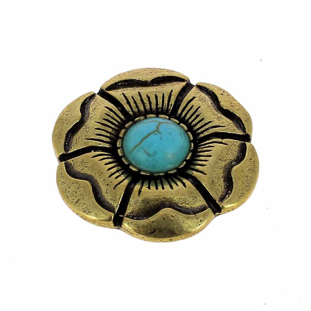 Ce concho à visser a une forme de fleur avec une jolie incrustation imitant une pierre de turquoise. Il permettra d'apporter une touche élégante et colorée à vos créations en cuir : maroquinerie, ceinture, porte-clés...