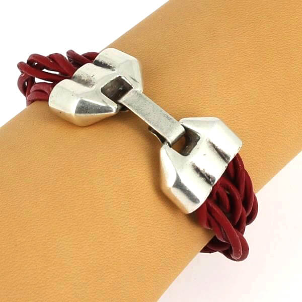 Fermoir bijou avec une fermeture par clip triple entrées pour 3 lacets ronds en cuir de 5 mm de diamètre chacun. Appliquez un point de colle cyanoacrylate (super glue) dans le fermoir pour maintenir les lacets.