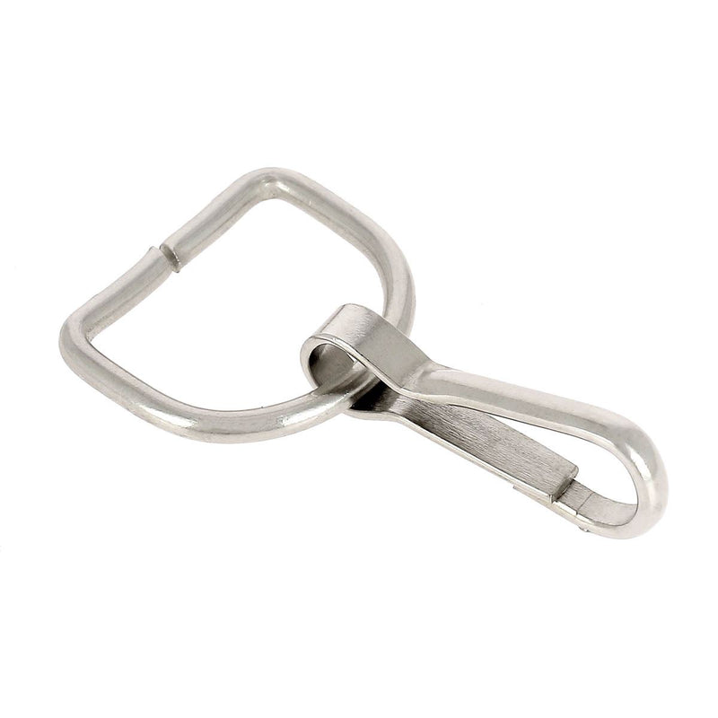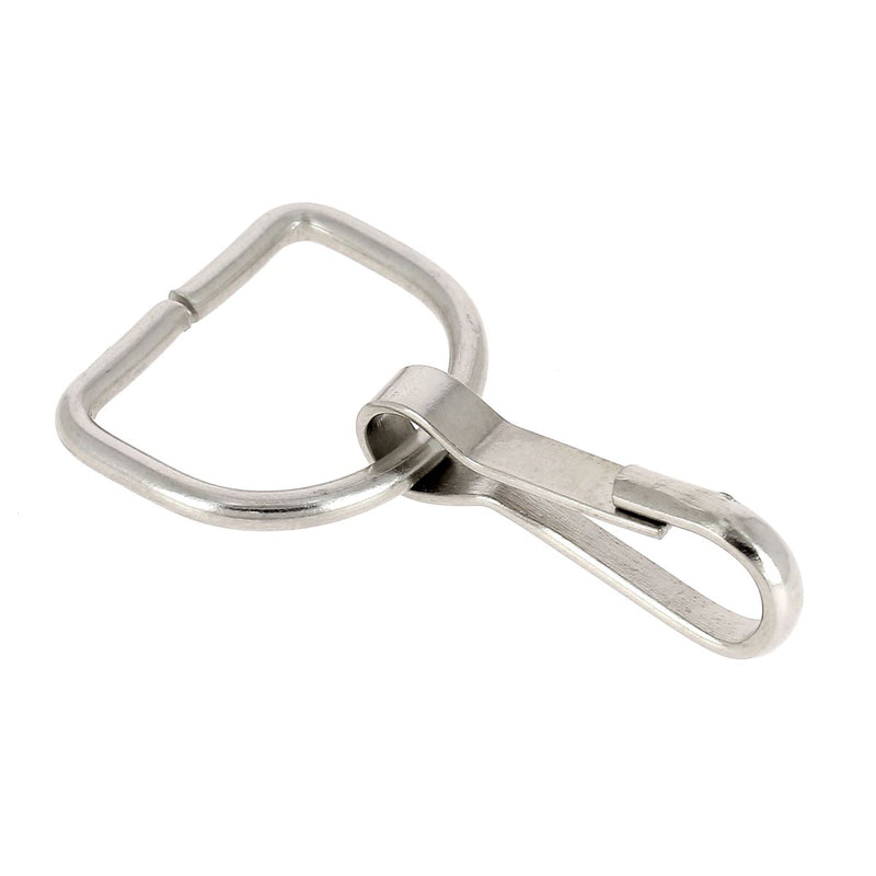 Mousqueton à ouverture latérale avec une attache demi-ronde pour une lanière en cuir de largeur 20 mm maximum.