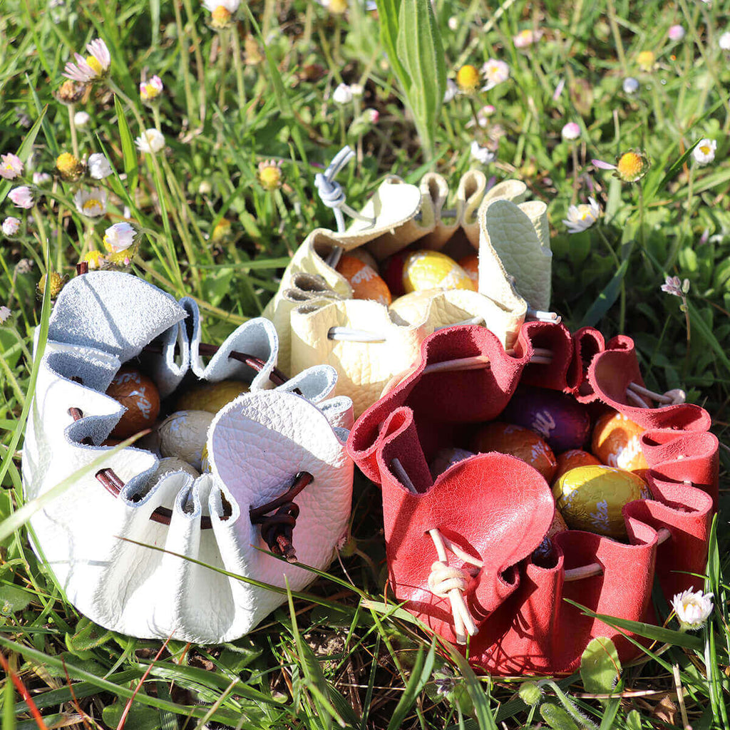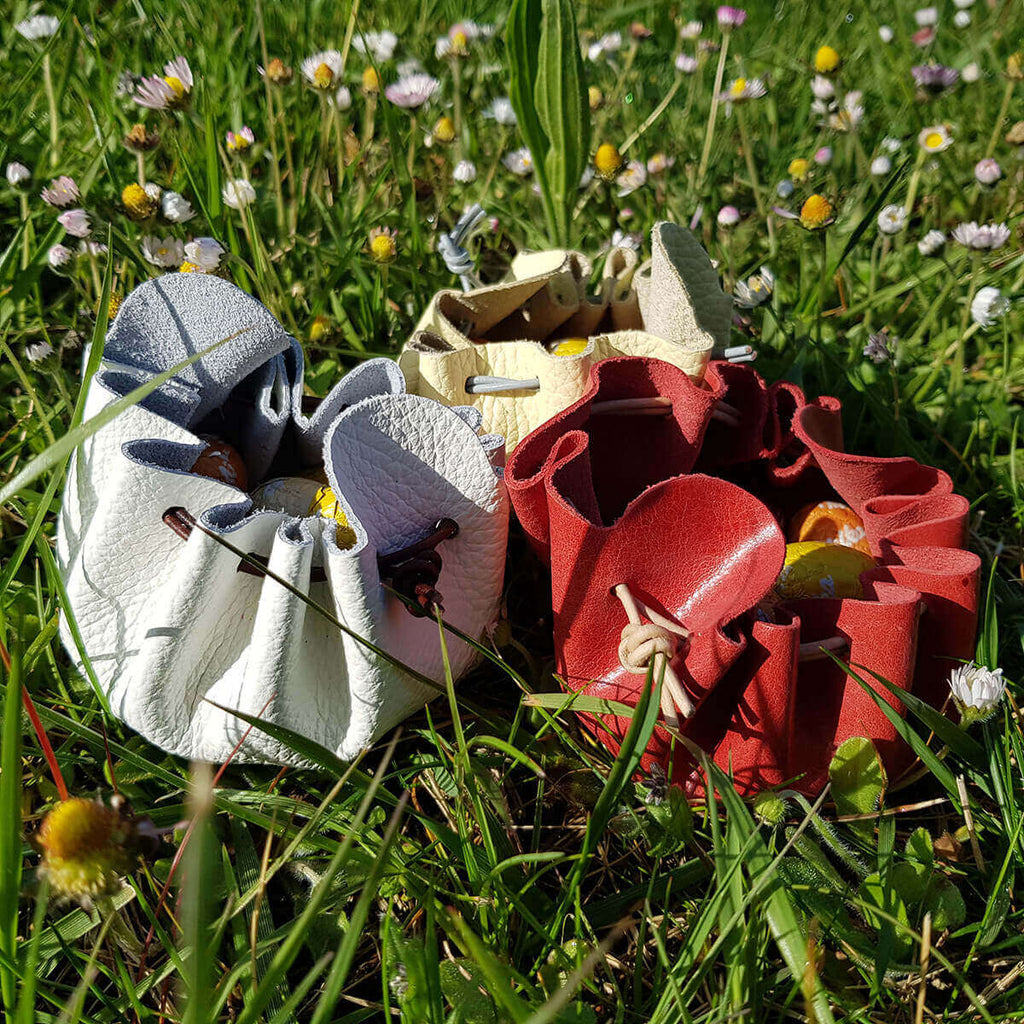 La bourse en cuir s'ouvre simplement en tirant sur les deux 'oreilles' et se ferme en tirant sur les deux liens.