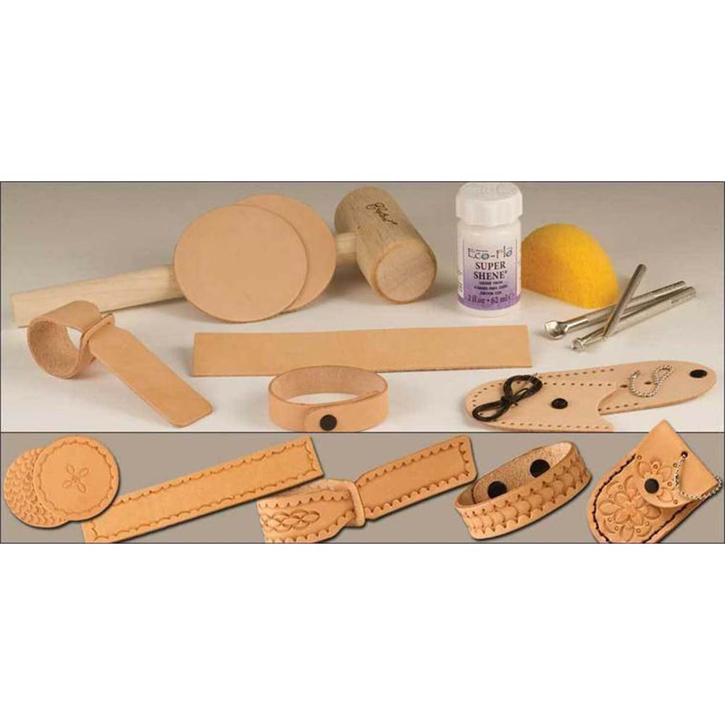 Ce kit contient quelques outils de base et les morceaux de cuir pré-découpés qui vous permettront de réaliser six projets de maroquinerie :