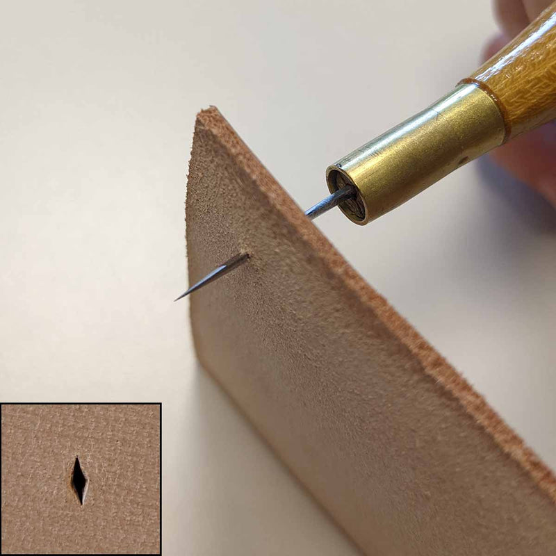 La lame de forme losange (pointe diamant) est livrée parfaitement affûtée afin de percer avec facilité le cuir, même le plus épais et réaliser une couture point sellier.