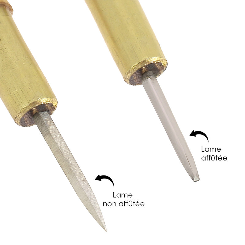 Au fur et à mesure de son utilisation, l'alêne aura besoin d'être de nouveau affûtée. Pour une utilisation optimale, nous vous conseillons d'affiner l'affûtage régulièrement en utilisant un strop et de la pâte à affûter.