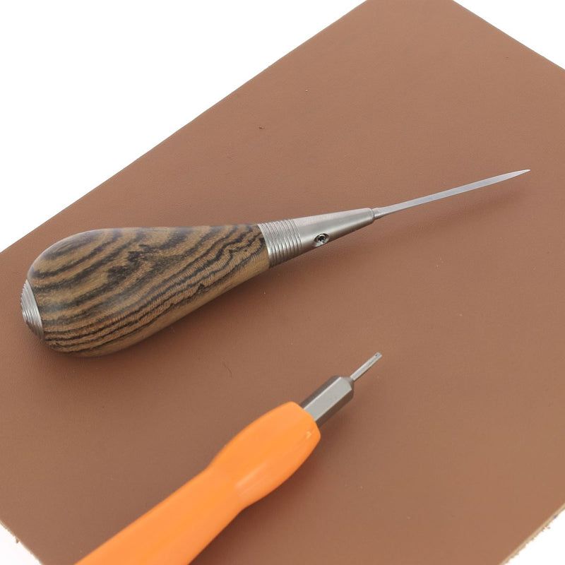La forme de la lame a été parfaitement étudiée afin de pénétrer dans le cuir comme dans du beurre, mais aussi de pouvoir en ressortir sans avoir à ressentir ce petit point de blocage propre aux alênes ordinaires.