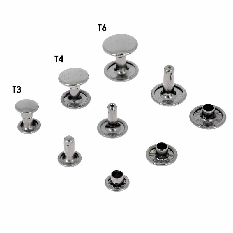Ils se montent avec la pince, la presse ou le manche à frapper et un jeu de pose pour rivets double calotte T3 adapté à l'outil de pose (en vente séparément).