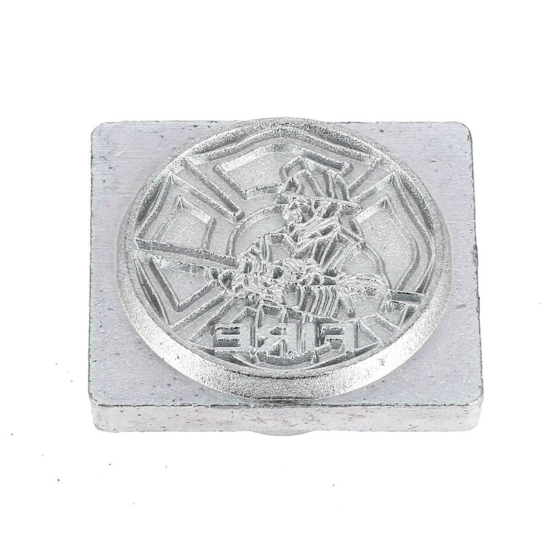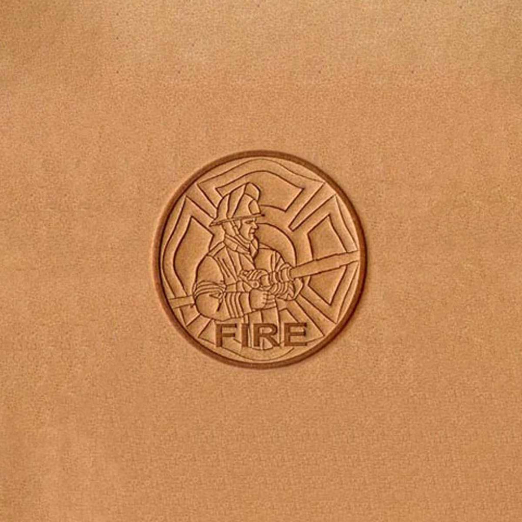 Ce matoir 3D représente un badge avec un pompier qui tient une lance à incendie. L'inscription "FIRE" signifie "feu".