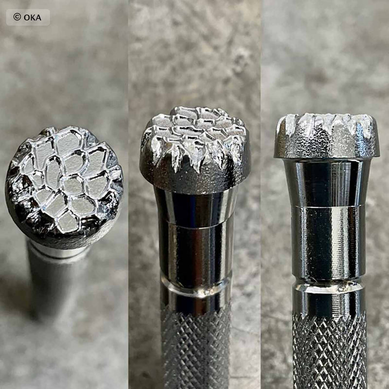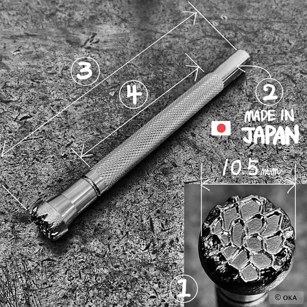 OKA est un fabricant Japonais passionné par le travail du cuir. Il fabrique des outils de haute qualité, agréables à utiliser et adaptés aux débutants comme aux confirmés.Les matoirs sur manche Matting sont utilisés pour réaliser des textures de fond, en périphérie du dessin afin de le mettre en valeur et combler l'espace autour de celui-ci (voir exemple en photo 5). Ils augmentent la profondeur et permettent ainsi de faire ressortir les reliefs.