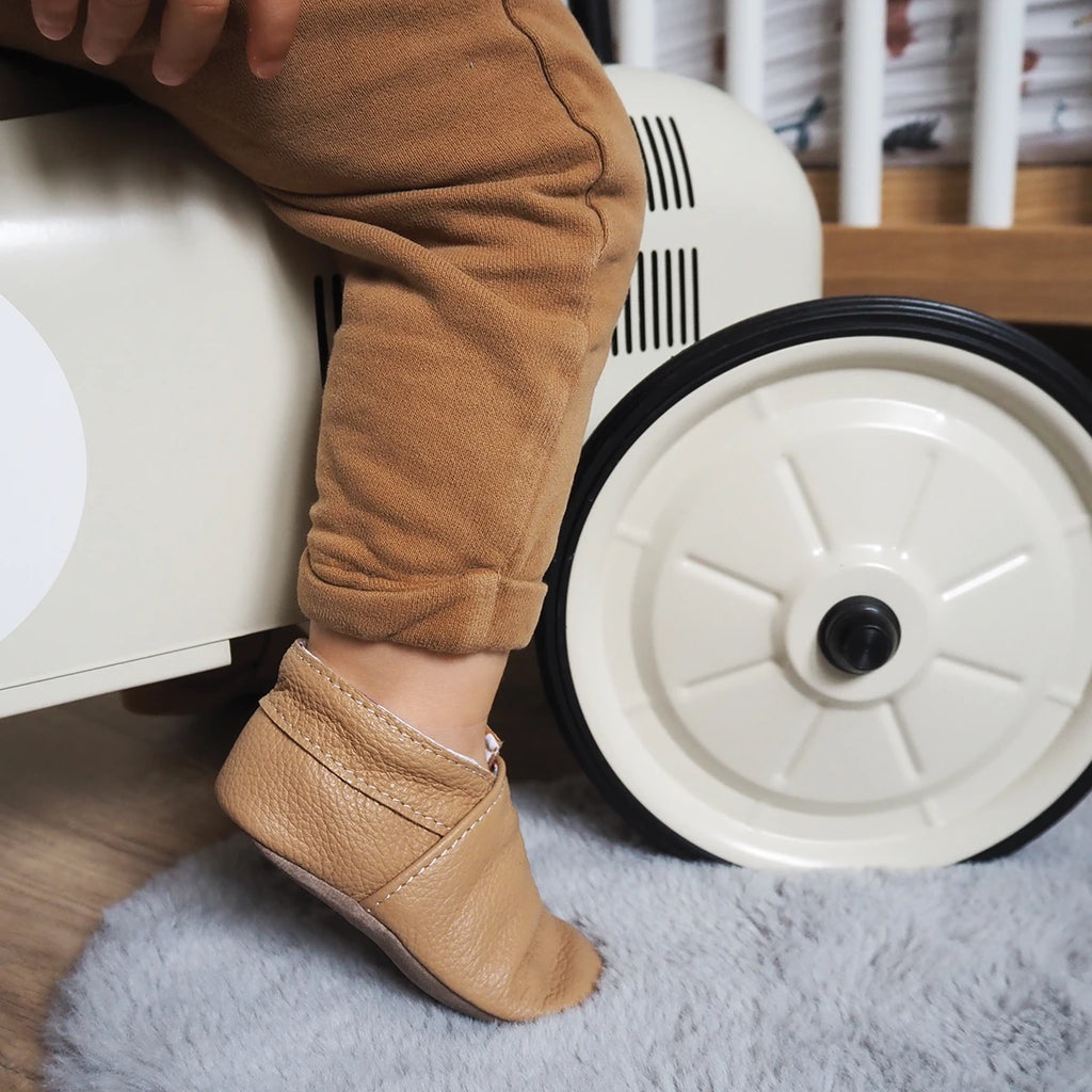 Nos chaussons permettent à l'enfant de garder une sensation de "pieds nus" et leur semelle en croûte de cuir leur permet d'être antidérapants. La forme est identique pour le pied droit et gauche.