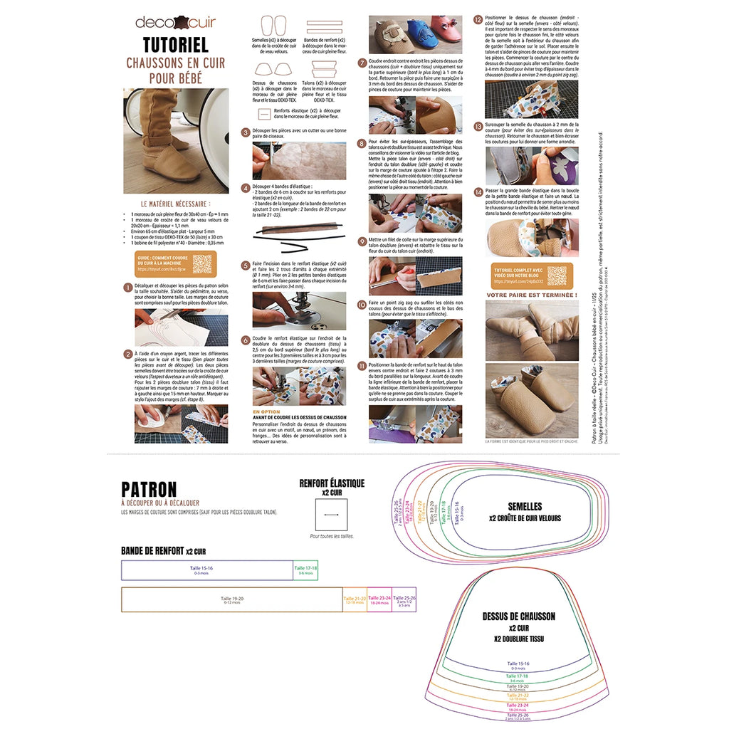Confectionnez vos propres chaussons en cuir pour bébé : à coudre à la main ou avec une machine à coudre familiale. Patron en vente avec les tailles 15 à 26 (3 mois à 5 ans) et un pédimètre. Nous vous proposons trois versions, selon vos besoins : patron papier en taille réelle ou patron en PDF à imprimer, avec ou sans licence commerciale.