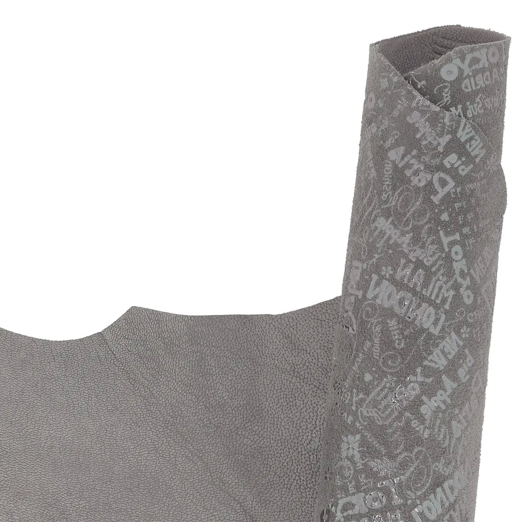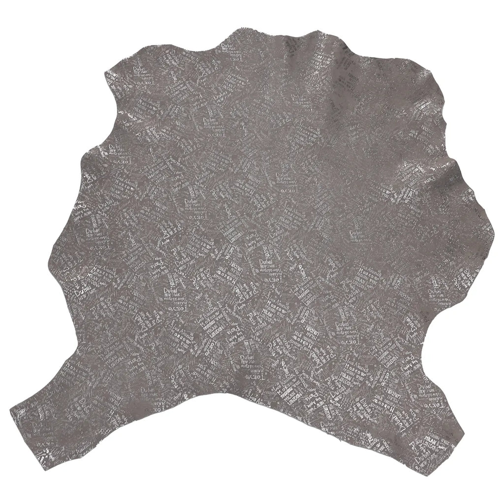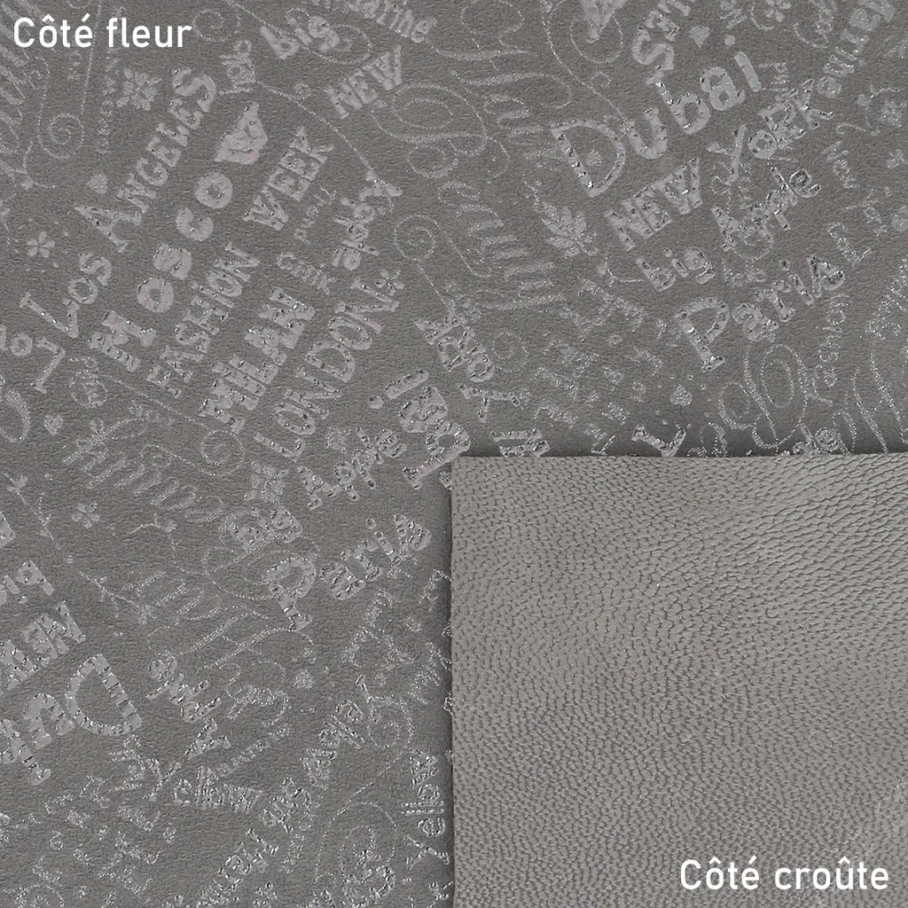 Ce cuir de chèvre souple en velours gris taupe argenté se distingue par son imprimé représentant les noms de grandes villes emblématiques (Dubaï, Paris, New York...). Son fond est gris taupe tandis que l’imprimé argenté apporte une dimension narrative et voyageuse à ce cuir.