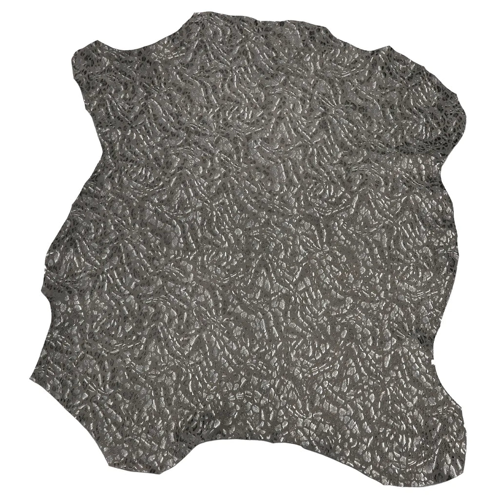 Ce cuir de chèvre présente une teinte grise rehaussée par un imprimé léopard brillant et tendance. Son grain velours apporte un toucher agréable et permet de travailler la matière facilement à la main comme à la machine.