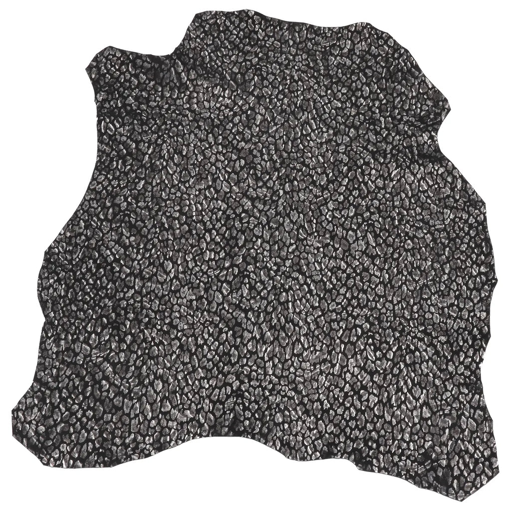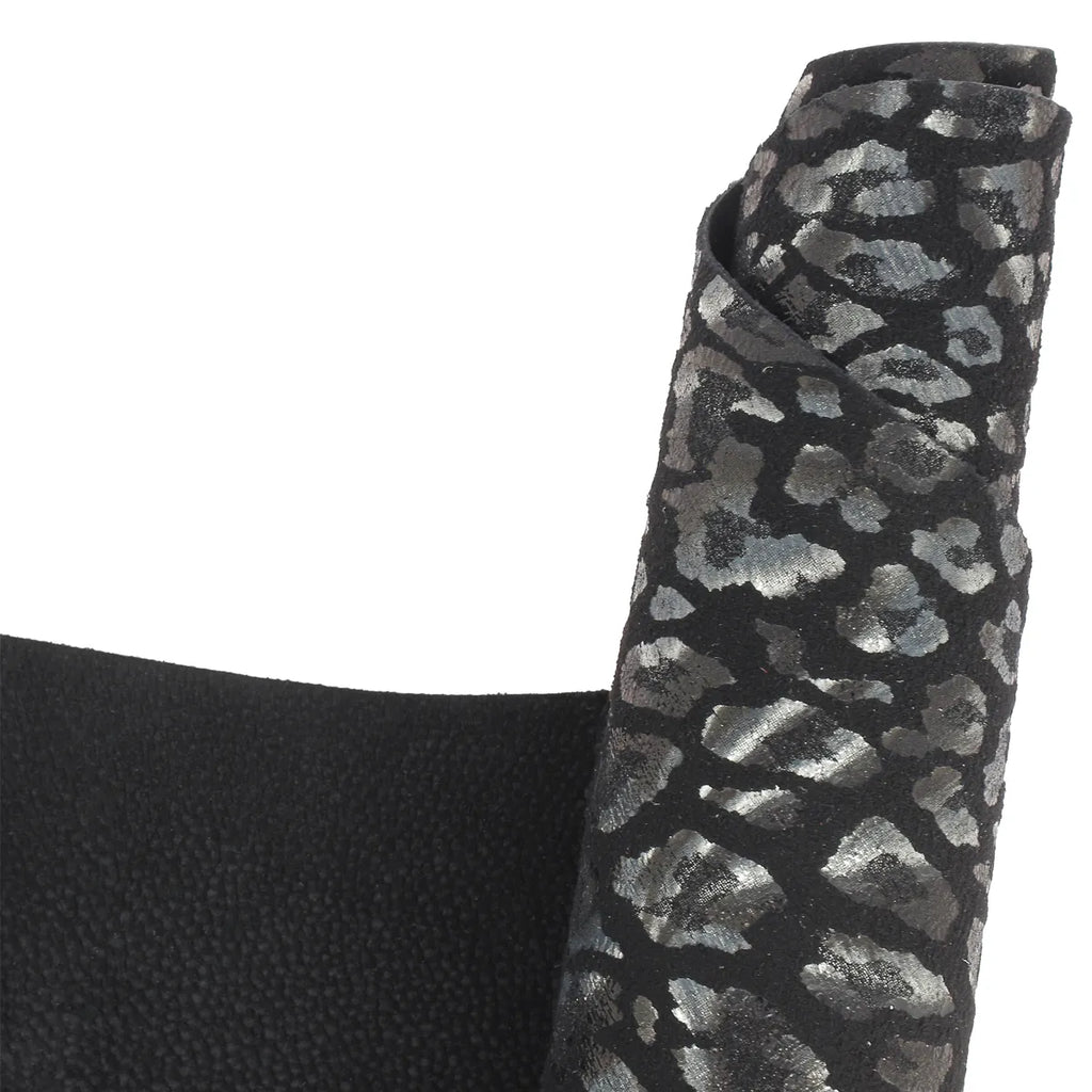 Ce cuir de chèvre fantaisie présente une teinte noir orné d’un imprimé léopard élégant à l'aspect brillant. Son grain velours lui confère un toucher agréable et facilite le travail à la main comme à la machine.