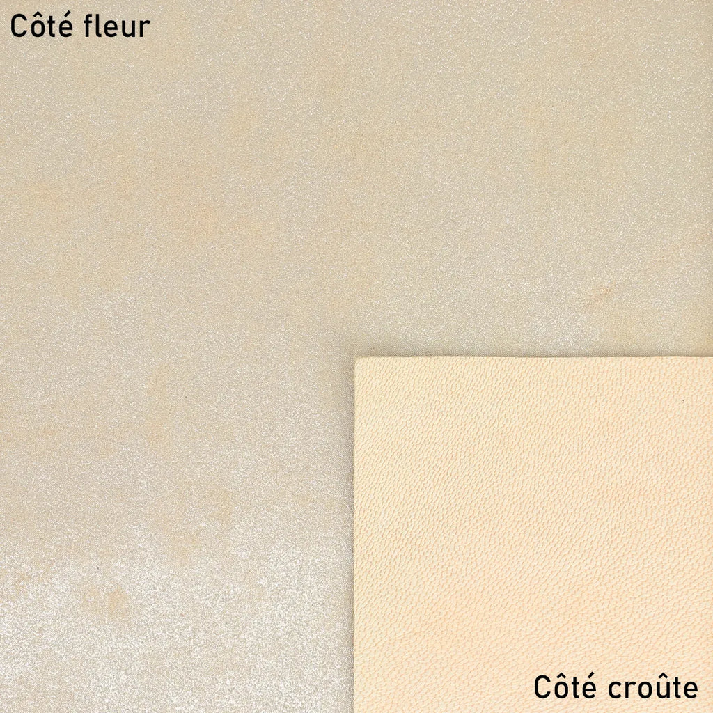 Ce cuir de chèvre marbré or se distingue par ses reflets dorés pailletés, qui varient selon la lumière pour un rendu visuel lumineux. Son grain velours doux révèle une finition métallisée et à l’abris de la lumière un effet marbré argenté.