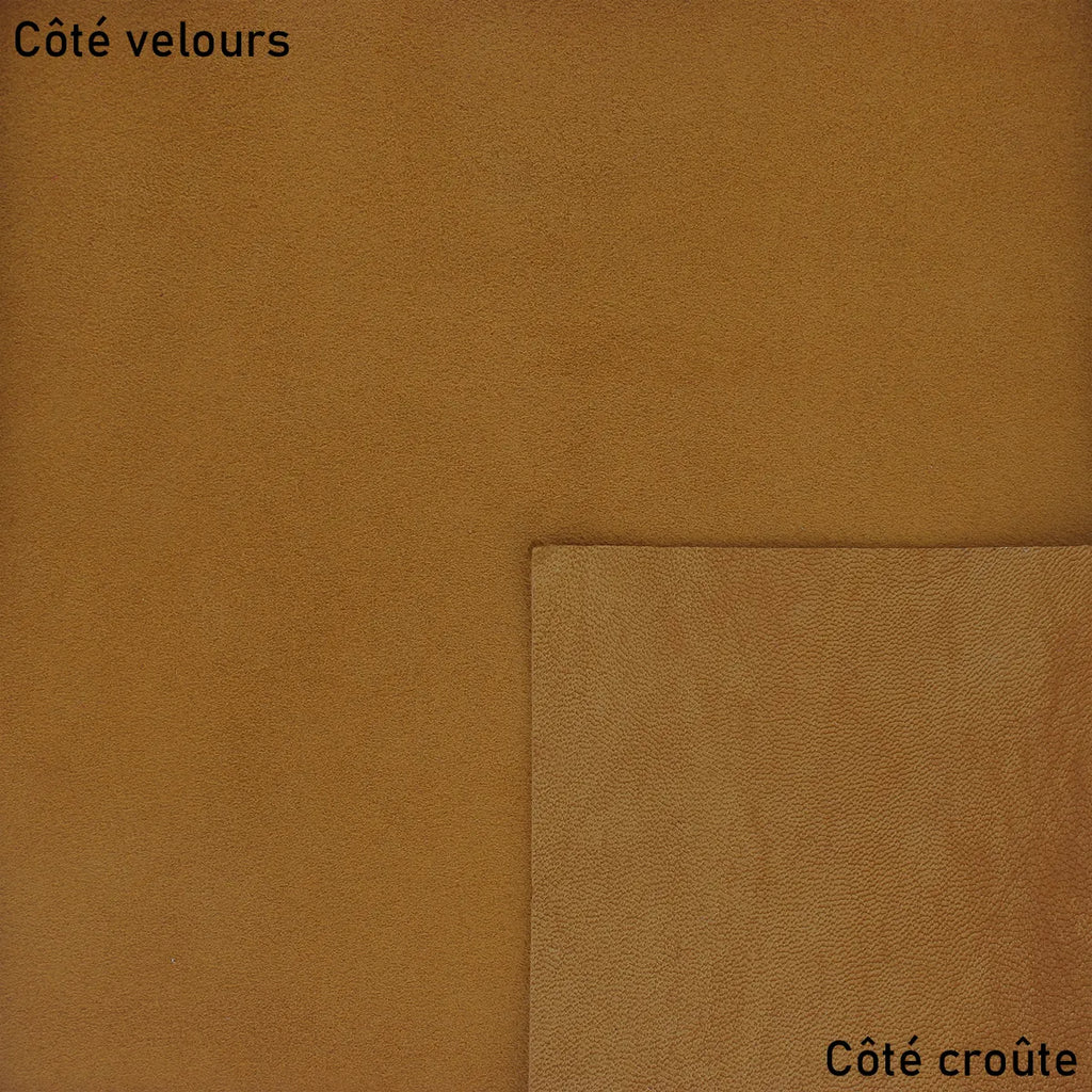 Laissez-vous séduire par la chaleur du cuir de chèvre velours couleur miel. Avec sa douceur et sa souplesse, ce cuir de chèvre velours est parfait pour la création de doublure, bourse, pochette, vêtement, coussin, décoration, accessoire...