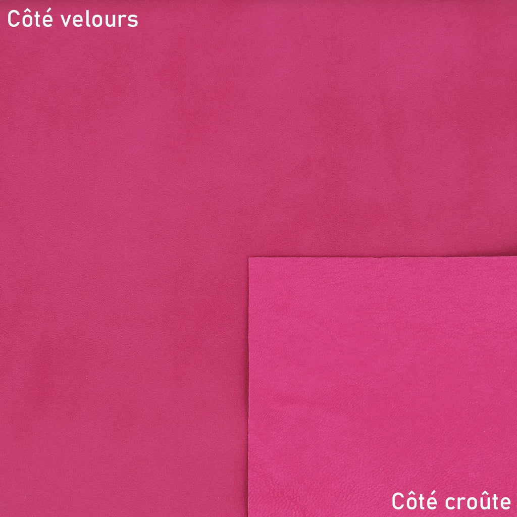 Jolie peau en croûte de cuir velours couleur rose fuchsia. Sa douceur, son aspect velouté et sa couleur intense apporteront du caractère à vos créations. Souple et facile à coudre, ce cuir de chèvre velours est parfait pour la création de doublure, bourse, pochette, vêtement, coussin, décoration, accessoire...