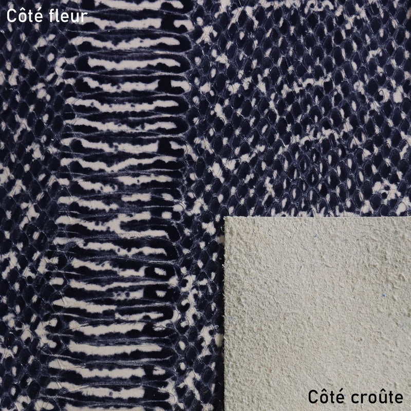 Osez l'originalité avec ce cuir de veau imitation serpent, il donnera un style exotique à vos créations tout en restant chic. Ce cuir très souple a une teinte noir légèrement bleutée.