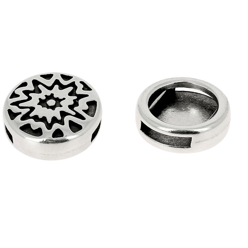 Cette perle coulissante en métal se glisse dans un lacet en cuir plat de 10 mm de largeur maximum pour réaliser un bijou fantaisie ou un accessoire fait main.
