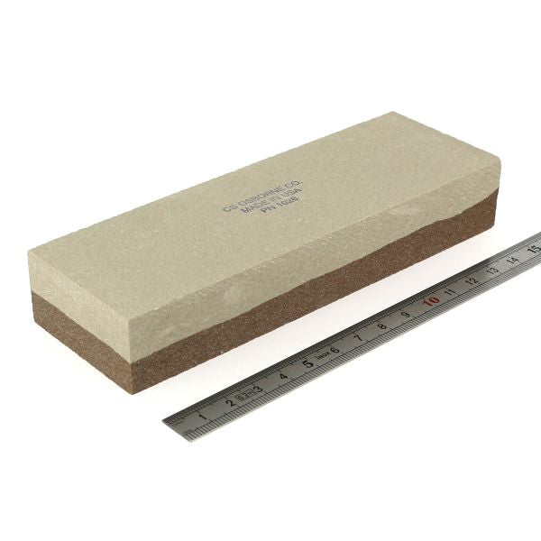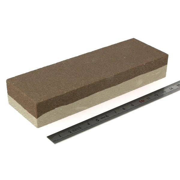 Pierre double face avec deux grains différents : un côté avec un grain moyen 120 (côté foncé) pour commencer l'affûtage et un côté avec un grain fin 320 (côté clair) pour la finition.