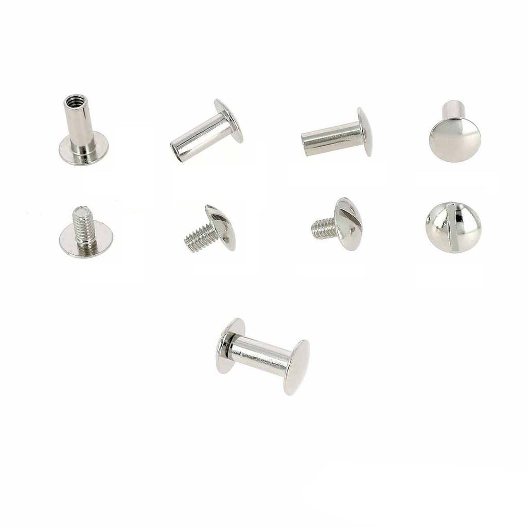 Vis chicago en acier, légèrement bombées, idéales pour fixer des lanières à un sac, des boucles de ceintures ou assembler des pièces de cuir. Elles se montent facilement, sans outils de pose particulier et se dévissent si vous souhaitez modifier votre création.